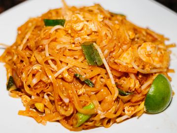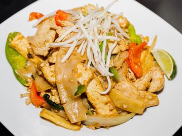 A stir- fried rice noodles dish with egg, onion, bean sprouts, crush peanuts & your choice of meat or tofu.
