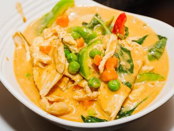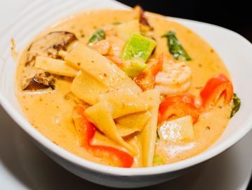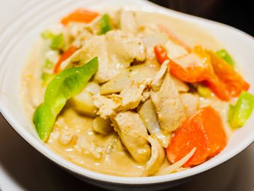 Coconut cream, eggplants, bell peppers, basil leaves, bamboo shoots & your choice of meat or tofu. Served with a cup of white rice.