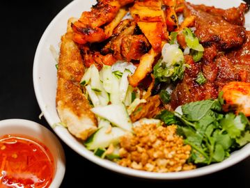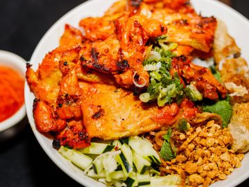 Grilled lemon grass chicken, marinated pork , vermicelli, lettuce, mints, cilantro, cucumber, grilled shrimp & eggroll, topped with scallion oil & fried shallots, PEANUTS
