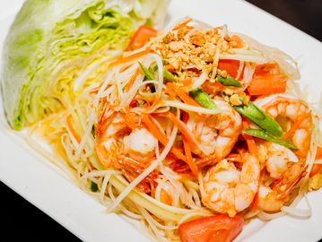 Mixing of shredded green papaya, tomatoes, green beans with shrimps & garlic-lime vinaigrette.