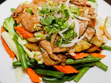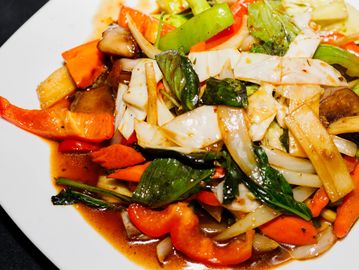 A stir-fried vegetable dish with eggplants, cabbages, mushrooms, bamboo shoots, bell peppers, onions & your choice of meat or tofu. Served with a cup of white rice.