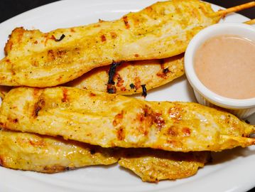 Grilled chicken skewers marinated with different Thai spices . They are served with a side of Thai creamy peanut dipping sauce.