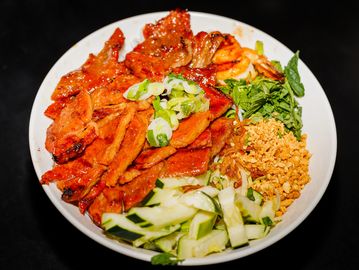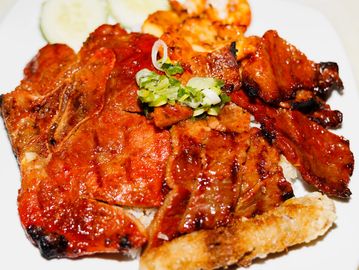 Grilled marinated pork, pork chop ,shrimps, chicken, egg roll, topped with scallion oil & fish sauce on the side.
