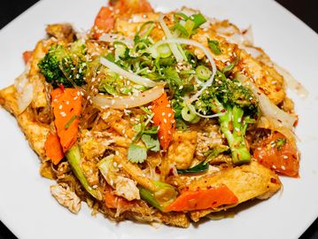 A stir-fried noodles dish with egg, onion, celery, mushrooms, broccoli, cabbage, carrot, tomatoes, baby corn & your choice of meat or tofu.
