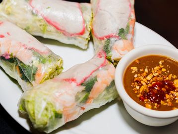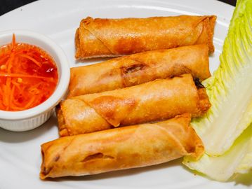 Crispy roll with ground pork or tofu, glass noodle, vegetables, wrapped in rice paper & a side of fish sauce
