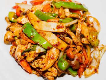 A stir-fried vegetable dish with carrots, mushrooms, onions, bell pepper, bamboo shoots & your choice of meat or tofu. Served with a cup of white rice.