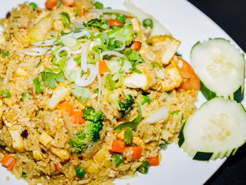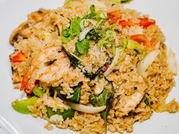 A fried rice plate with mushrooms, onions , bell peppers, basil leaves & your choice of meat or tofu.