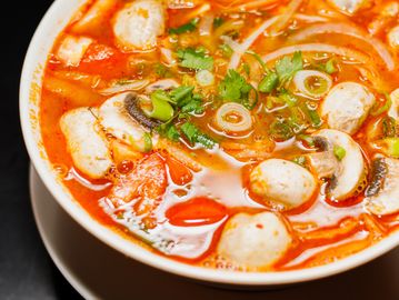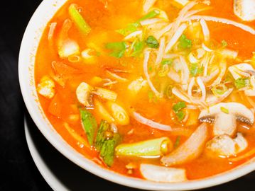A combination of lemongrass, galangal, kaffir lime lemon, fresh lime juice, mushrooms, tomatoes, onions & choices of meat or tofu.