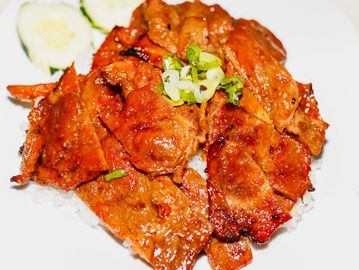 Griiled marinated pork, topped with scallion oil & fish sauce on the side.
