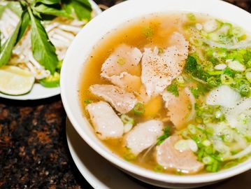 Meatballs, rare steaks, well done, onions, cilantro with beef bone broth, rice noodles & a side dish of bean sprouts, basil, lime wedges & jalapenos.