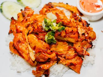 Grilled marinated lemongrass chicken, topped with scallion oil & fish sauce on the side.