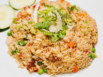 A flavorful fried rice with Shrimp, BBQ pork, Chinese sausage, carrot, green bean, snow pea, egg topped with black peppers, onion & cilantro.